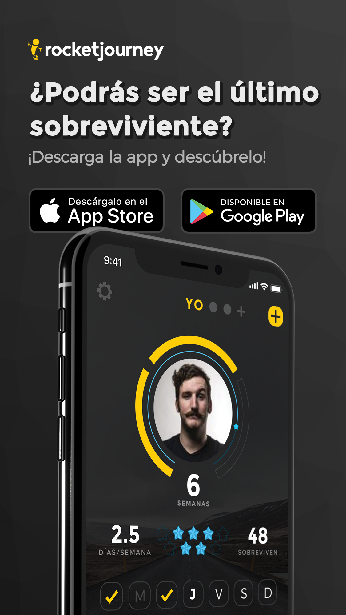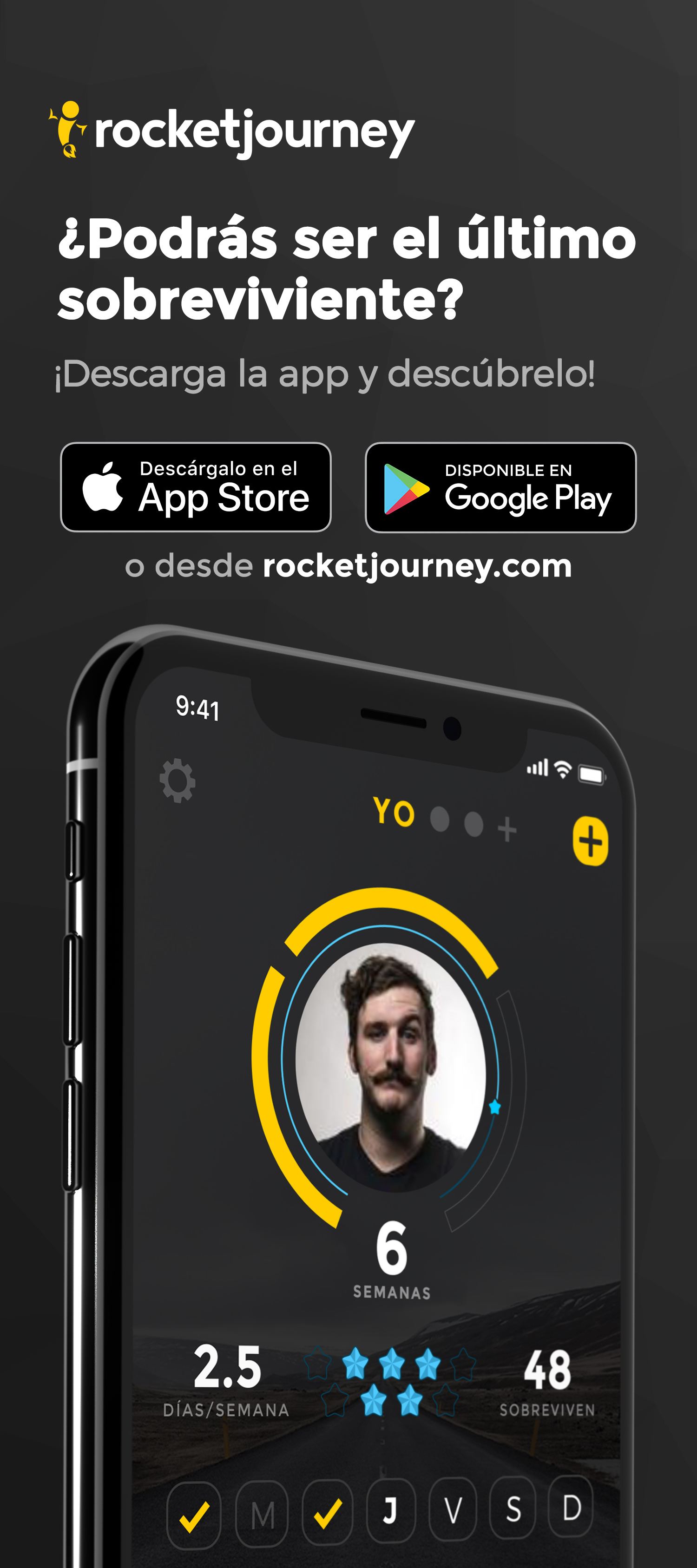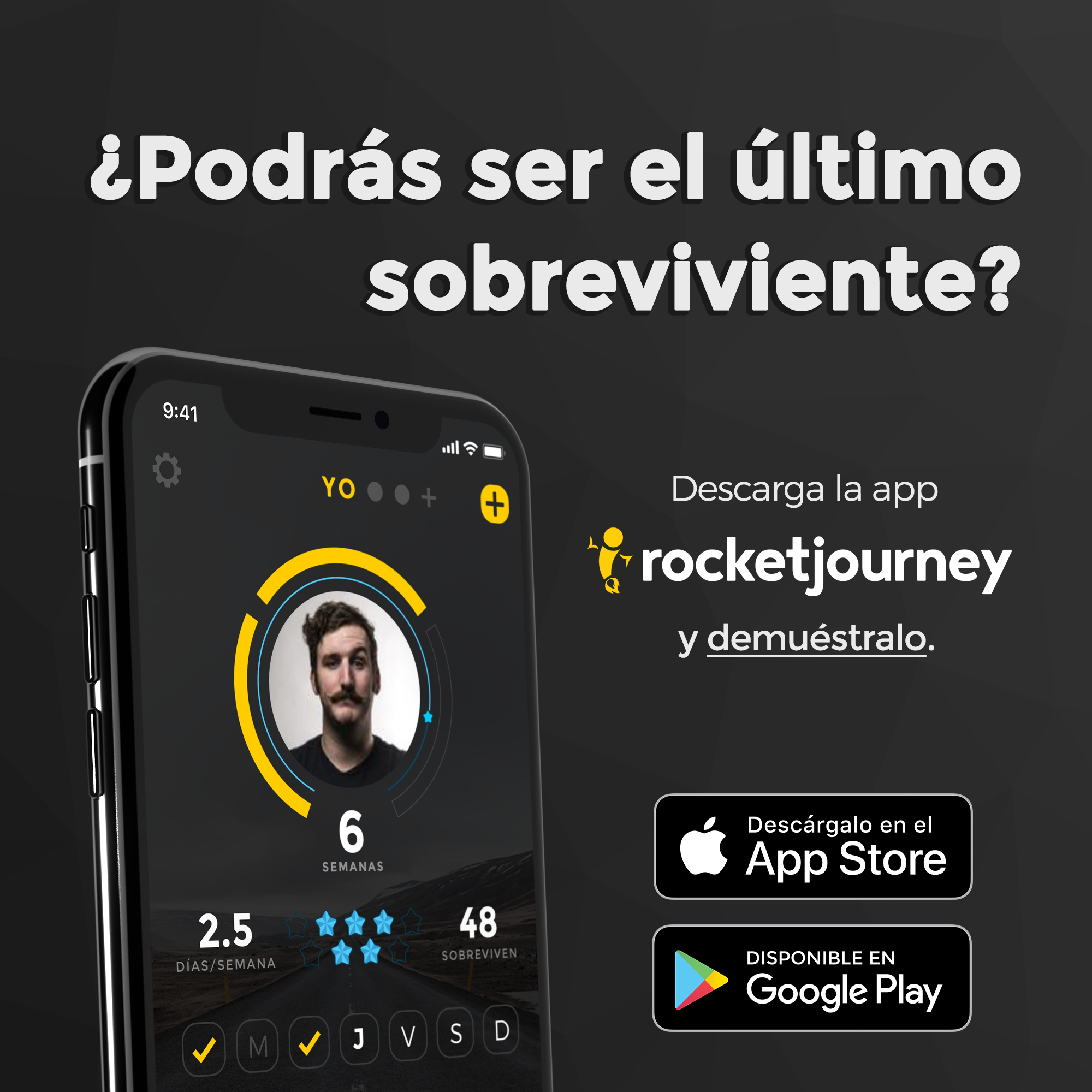 Éntrale al reto de supervivencia. Ejercítate al menos 3 veces por semana para mantenerte.Descarga la app en: http://www.rocketjourney.com/